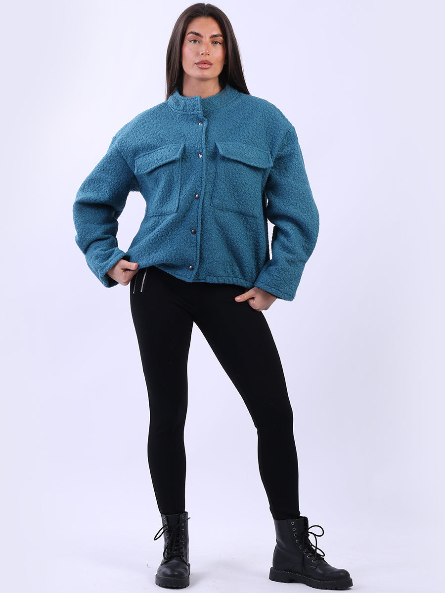 A trendy and easy to wear women's woolen jacket by Online Clothing Store. The jacket has front flap pockets and button fastening. Versatile to style on various occasions, its perfect for all classy ladies. Pair it with a plain top and bottoms for a casual chic look.