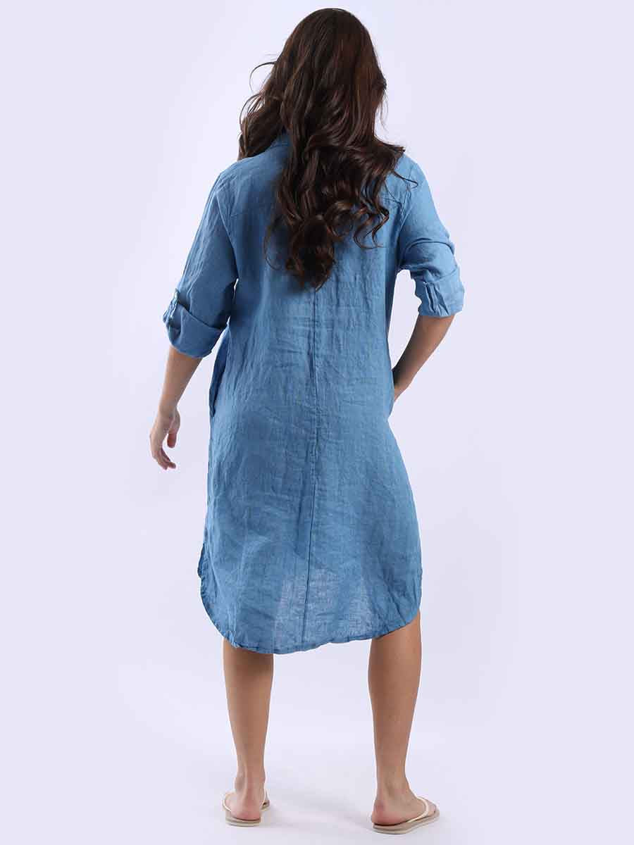 Breeze through sunny hot days in this classy plain dress from Fashion Clothing UK. Made in Italy with high-quality pure linen fabric that is light on every skin type, keeping in mind plus-size comfort, the dress features a collared neckline, rolled-up sleeves, a decorative front button, and functional side pockets. The dipped hem adds a stylish touch. Dress it with hat and a cross body bag for a perfect causal look.