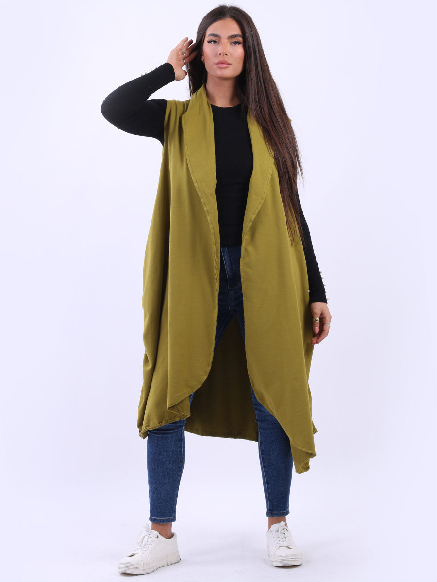 Trendsetters always love to know what is the clothing style in Italy and where to buy made in Italy clothing. Plus size boutique London is introducing the latest clothing fashion that every woman loves to add in their winter wardrobe for an exclusive Italian women look. This oversized longline jacket features waterfall neckline with open front, sleeveless lagenlook plus size fit and ruched detailing at sides. Take trendy clothes anywhere this season!