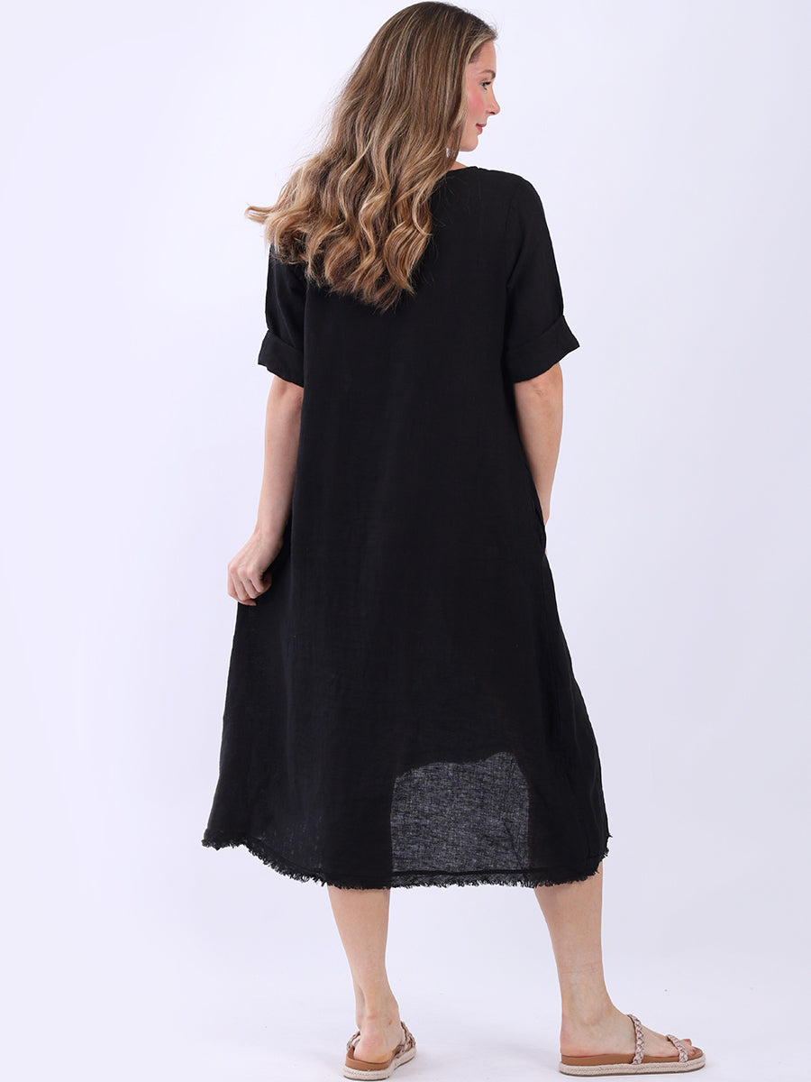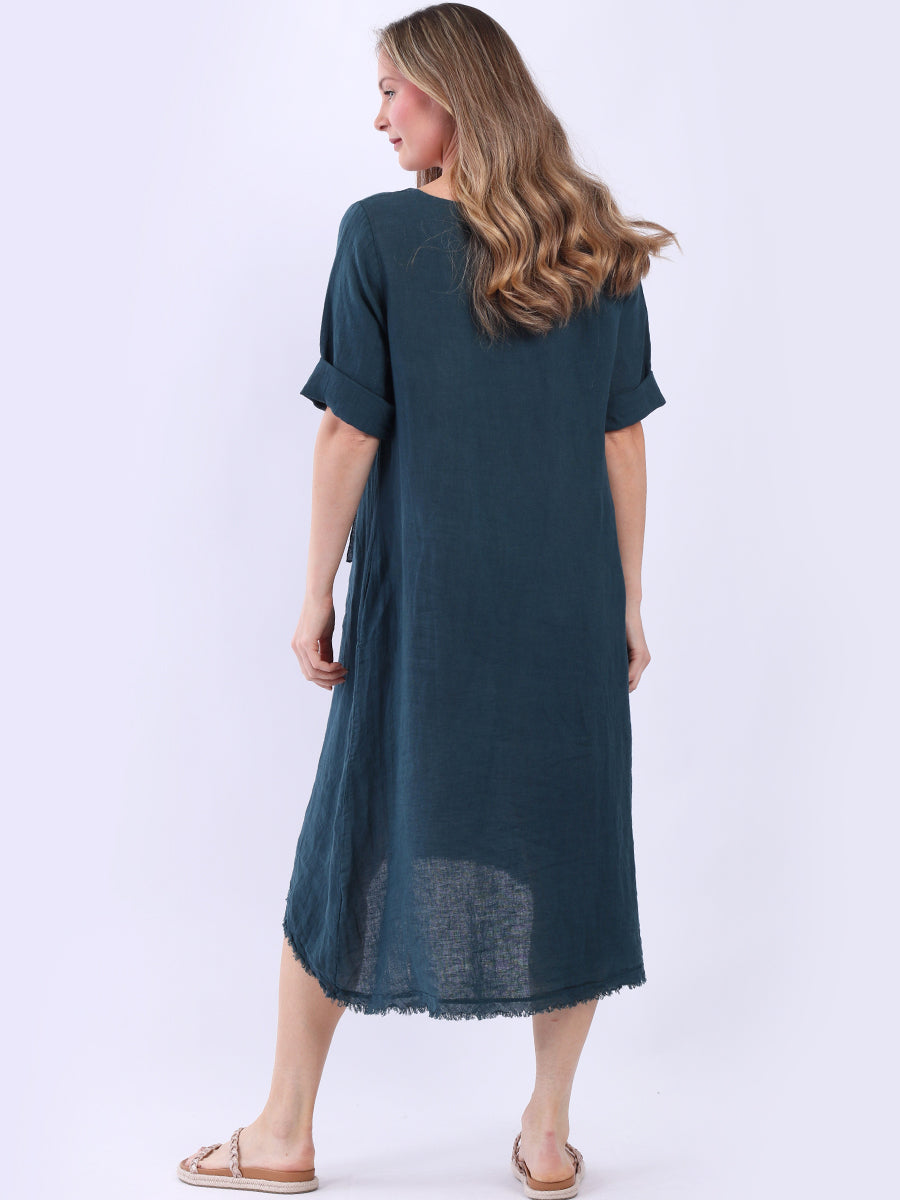 Hello Ladies! This plus size lagenlook linen dress is just the thing for your seasonal wardrobe. It is made in Italy and comes with lovely features like flower applique and dipped raw edge hem that make a unique contrast to its plain hue. Coming with rolled-up sleeves, side pockets and round neck it promises an undeniable comfort and ease. Ideal for pairing with a light cardigan, this dress is going to be a standout piece in coming fall.