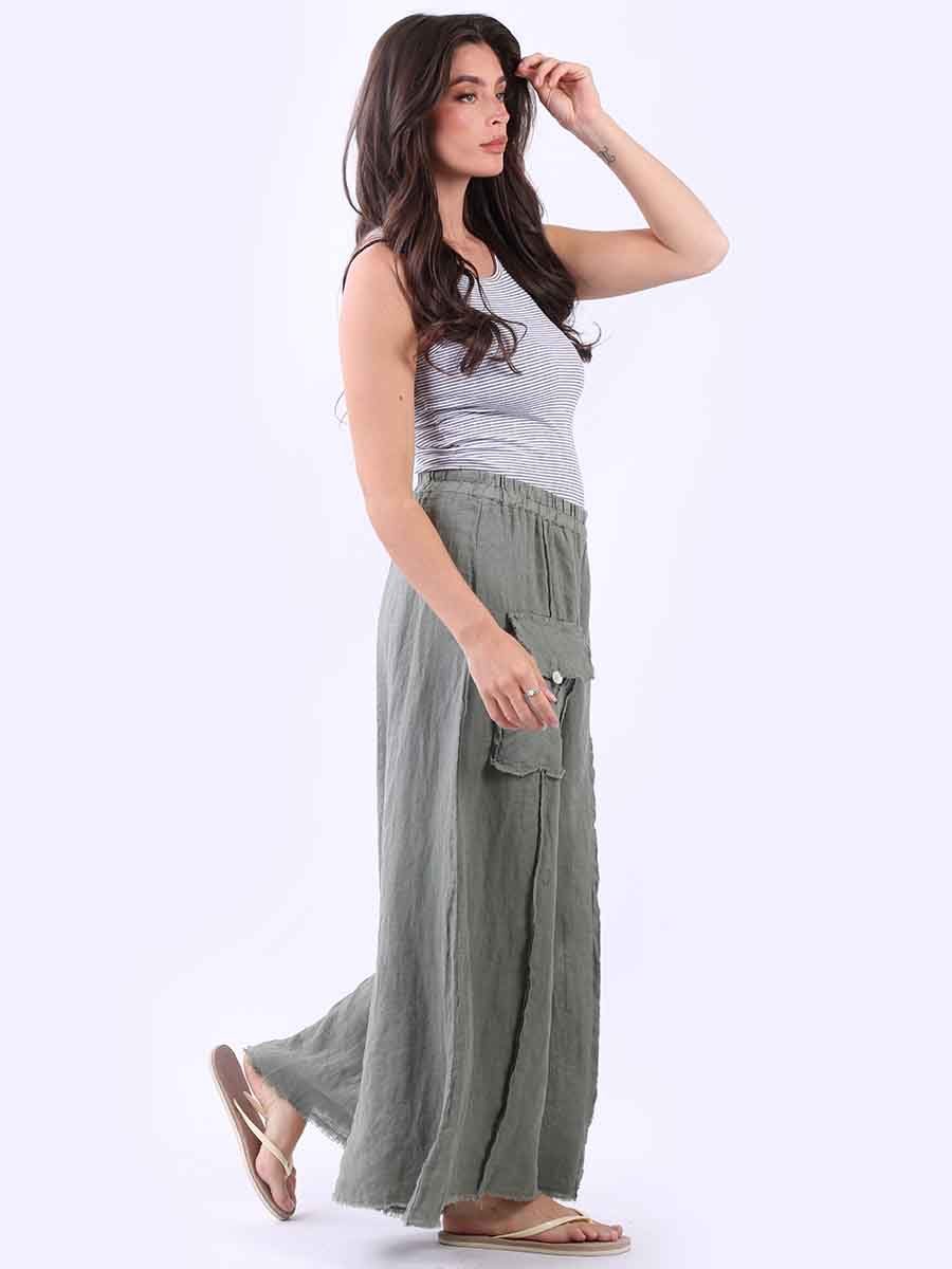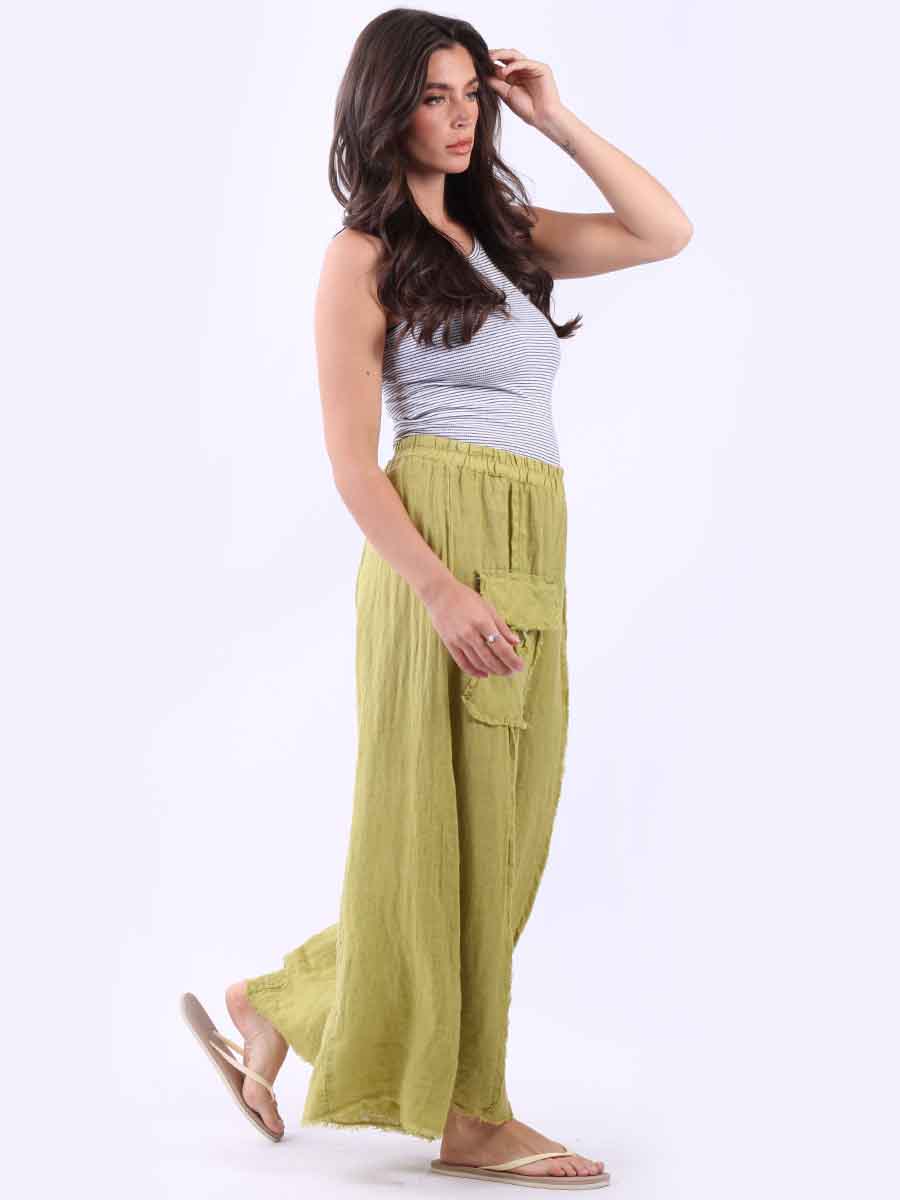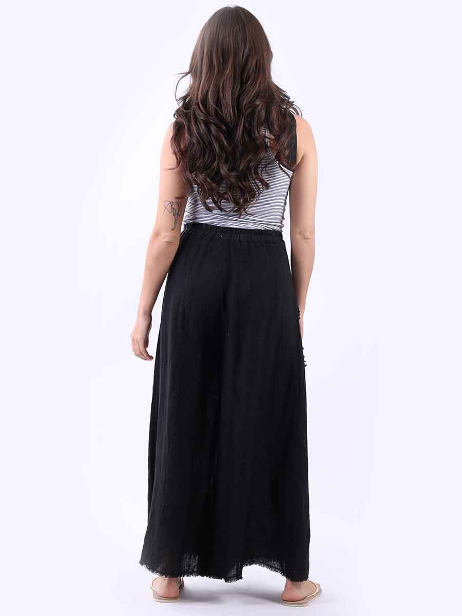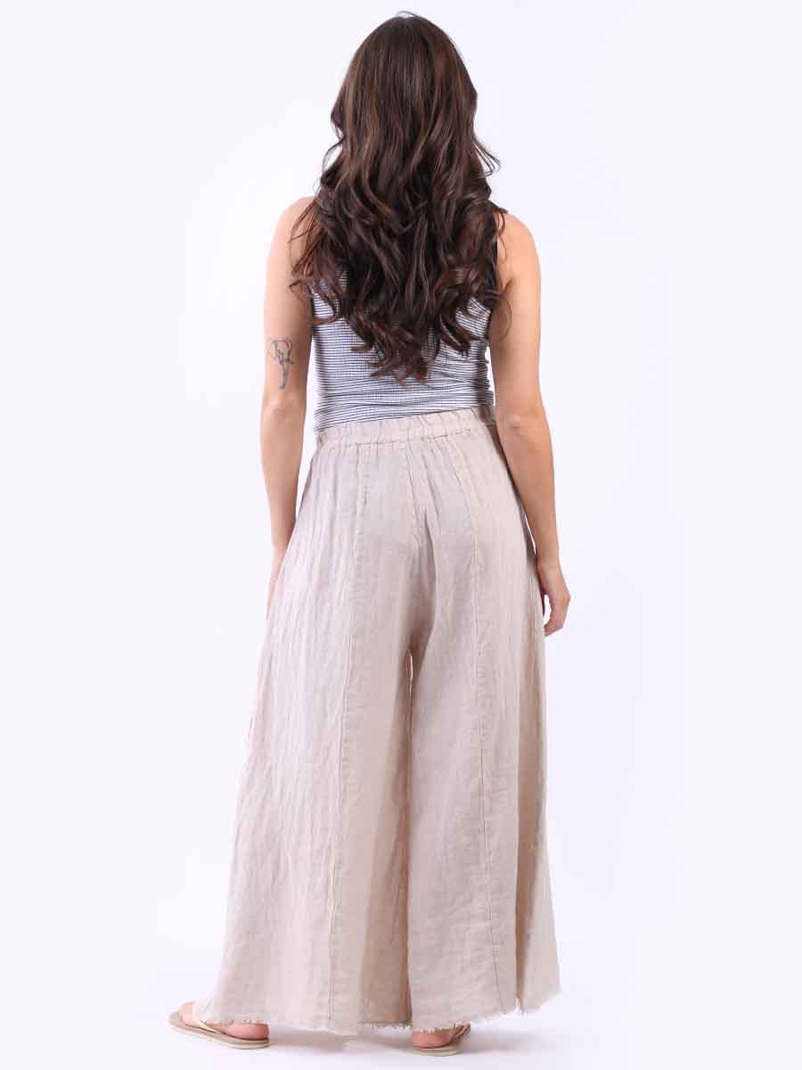 This refined Italian-made trouser, designed by Fashion boutique USA, has everything you need to elevate your everyday wardrobe. It is tailored from pure linen fabric for unmatched breathability and softness with basic features like an elastic waist, functional front pocket, and subtle raw edges. If you are looking for simplicity and sophistication in every outfit, these plain palazzos are a must-have addition to your wardrobe.