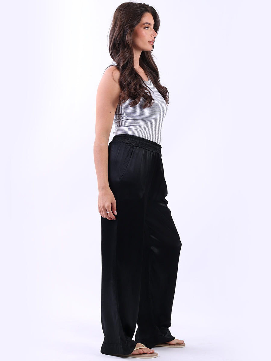 Step into effortless elegance with these made in Italy satin palazzo trousers. These wide-leg trousers feature a flattering high-rise fit with a comfortable elasticated waistband and side pockets for added ease. The fluid silhouette drapes beautifully, making them perfect for both lounging and dressing up. Style with a simple tank or a matching satin top for a chic, coordinated look.